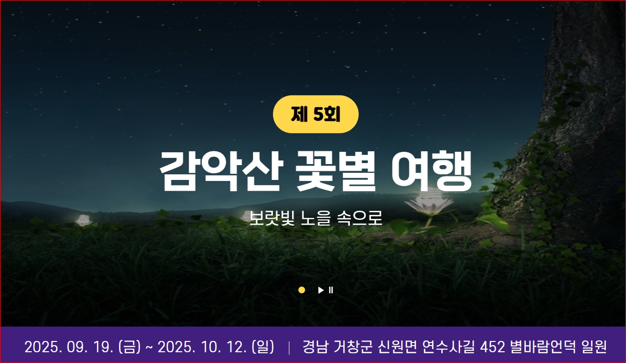 🌸 거창 감악산 꽃별여행 2025 – 가을꽃과 별빛 속 힐링 여행 경상남도 거창군 감악산에서 열리는 거창 감악산 꽃별여행이 2025년 9월 19일부터 10월 12일까지 개최됩니다.이번 축제는 가을꽃과 별