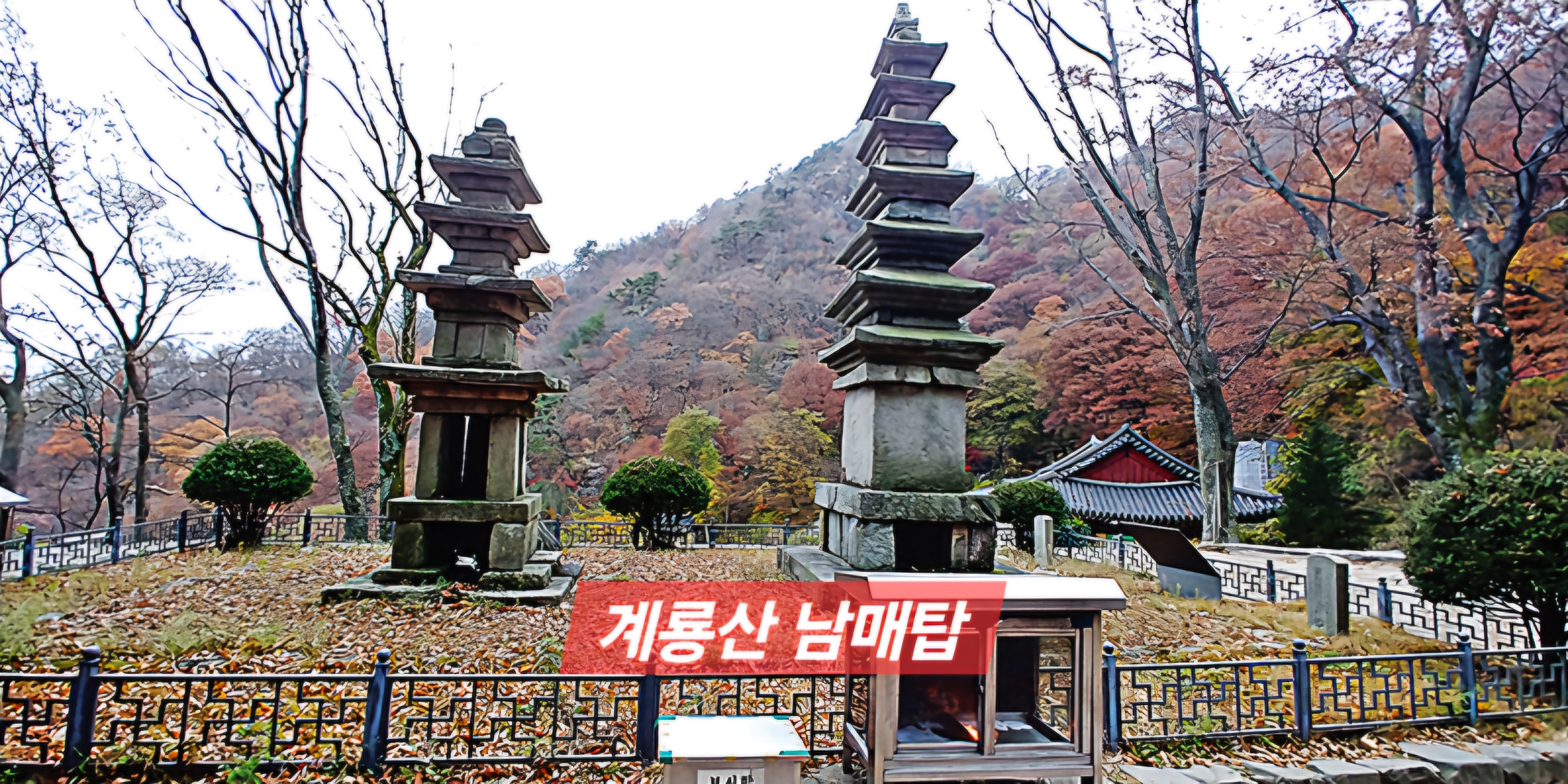 금잔디고개를 지나 조금 더 오르면 계룡산 능선에 **남매탑(청량사지 오층석탑/칠층석탑)**이 나타납니다. 남매탑은 스님과 호랑이에게 구출된 처녀에 얽힌 신비로운 전설을 품고 있으며, 가을 단풍에 둘러싸인 고즈넉한 석탑의 모습은 가을 산행의 백미를 장식합니다. 이곳에서 동학사 방면의 단풍 계곡을 내려다보는 조망도 일품입니다.
