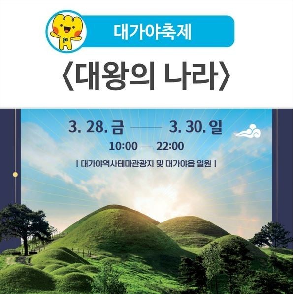 고령 대가야축제는 매년 경상북도 고령군에서 열리는 대표적인 문화축제입니다. 2025년 축제는 '대왕의 나라'를 주제로 **3월 28일(금)부터 3월 30일(일)**까지 개최됩니다. 주요 행사는 대가야역사테마관광지, 대가야박물관, 지산동고분군 및 대가야읍 일원에서 진행됩니다.