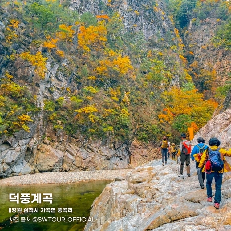 강원도 삼척의 덕풍계곡은 풍곡마을 입구에서 덕풍마을까지 6 km에 걸쳐 펼쳐지는 대자연의 절경입니다. 금강송 원시림, 병풍 같은 절벽, 수심 깊은 용소 세 구역으로 이어지는 풍경은 ‘천연 금강산’에 비견될 만큼 아름답습니다.