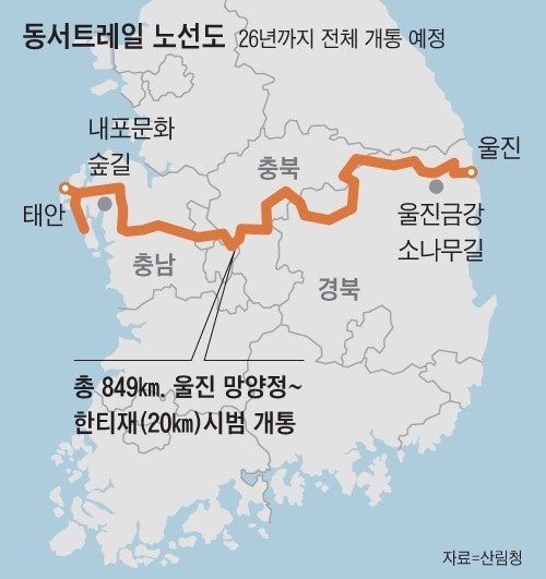 | 중부권(3편) | 세종 → 보은 → 문경새재 → 안동 | 약 260km | 백두대간 남단 통과, 산악형 트레킹 중심 |