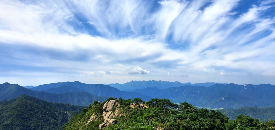 깎아지른 절벽 위 대야산 암봉 정상에서 내려다보는 삼도 풍경문경의 이 명품 코스는 초여름부터 늦가을까지