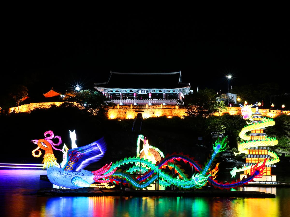 진주성 촉석루 앞의 진주유등축제 모습