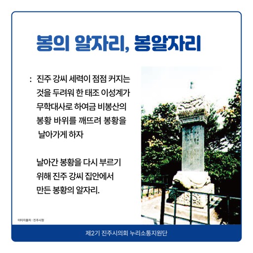 • 봉황(鳳)이 상징하는 것이 왕권과 국가의 안녕이라면, 봉 알자리 전설은 진주성이 국가적으로 중요한 의미를 가진 장소임을 강조하기 위한 후대의 창작 설화일 가능성이 있습니다.