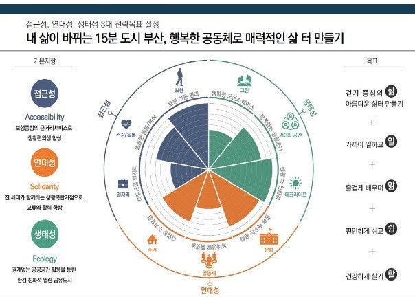 부산시의 15분 도시 정책은 크게 세 가지 핵심 가치를 중심으로 구조화되고 있습니다:
