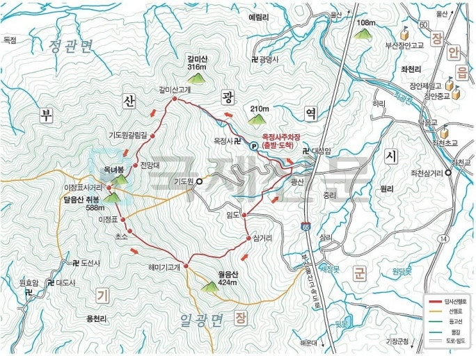 - 코스 (예시): 옥정사 주차장 옥정사 편백숲길 계단 달음산 정상 산불감시초소 해미기고개(해목고개) 월음산 해미기고개 광산마을 방향 하산 옥정사 주차장