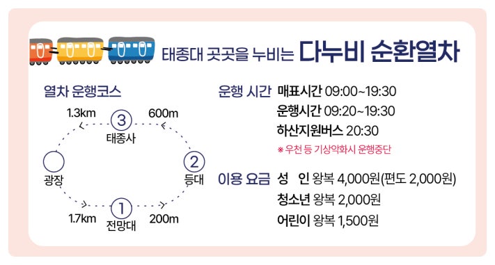 • 다누비 열차: 입구 ↔ 태종사 왕복, 성인 3,000 원
