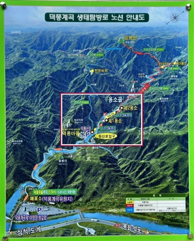 • 코스: 덕풍계곡관리사무소 → 덕풍마을 → 제1용소 → 제2용소 → 제3용소 (왕복)