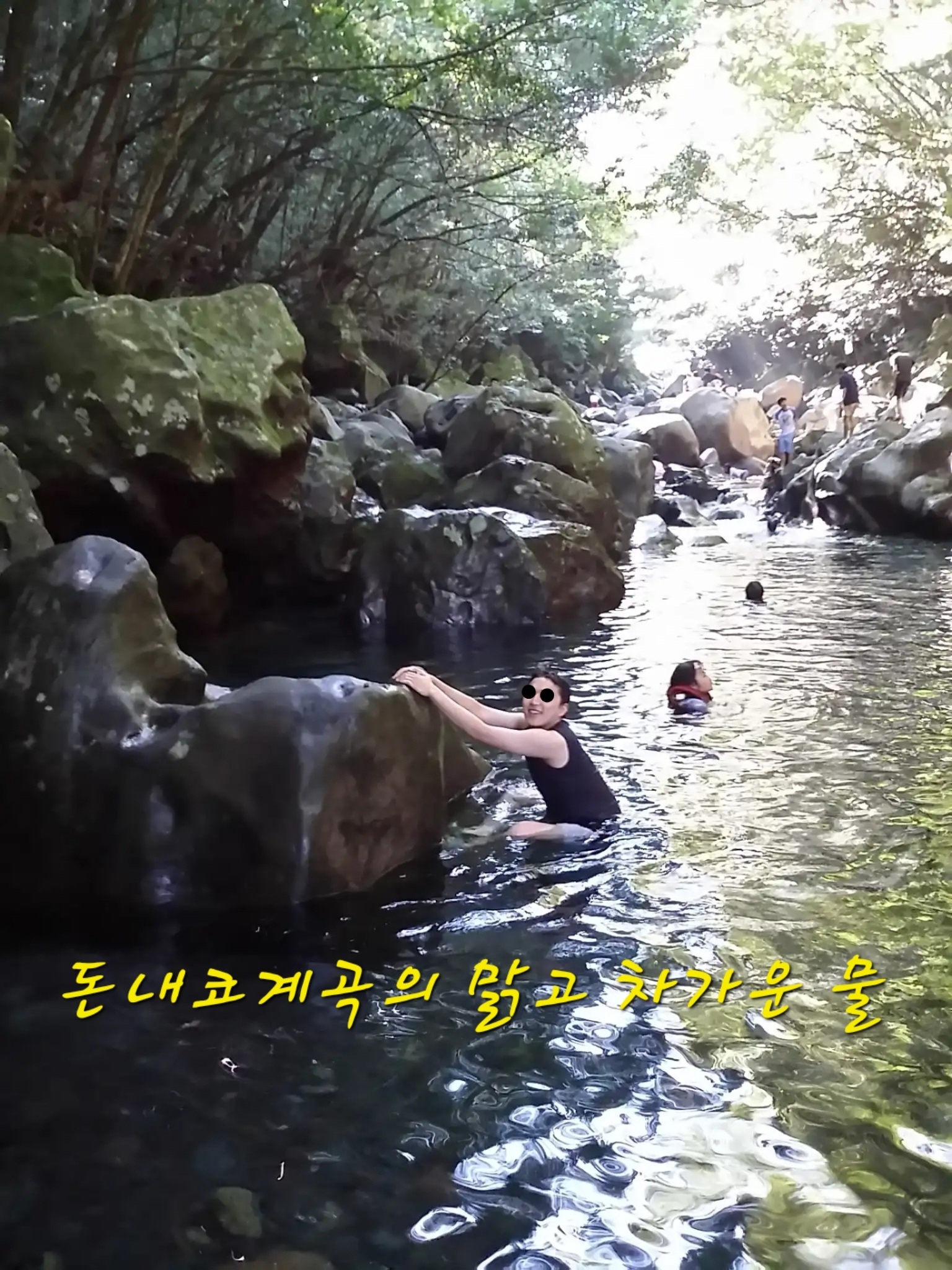 - 계곡 중간의 이끼 낀 큰 바위 앞
