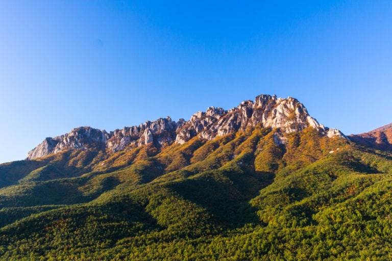 울산바위 코스는 설악산의 상징이라 불리는 바위 전망대로 오르는 길입니다. 단풍이 물드는 10월 중순~하순에는 산허리를 감싸는 붉은 숲과 흰 바위 절벽이 대비되어 장관을 이룹니다. 정상에 오르면 속초 시내와 동해 바다가 한눈에 펼쳐집니다.