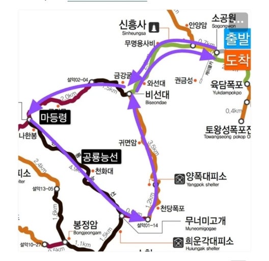 - 코스 경로: 설악동 탐방지원센터 (소공원) → 와선대 → 비선대