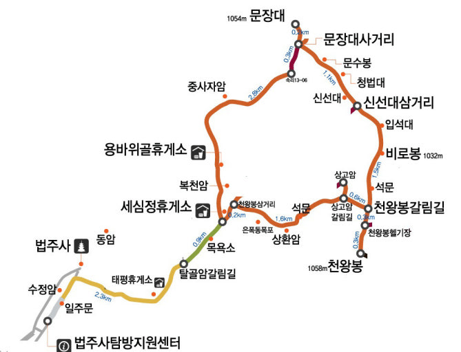 코스 경로 법주사 탐방지원센터 → 세조길(오리숲) → 세심정 → 냉천골 쉼터 → 문장대 (원점 회귀)