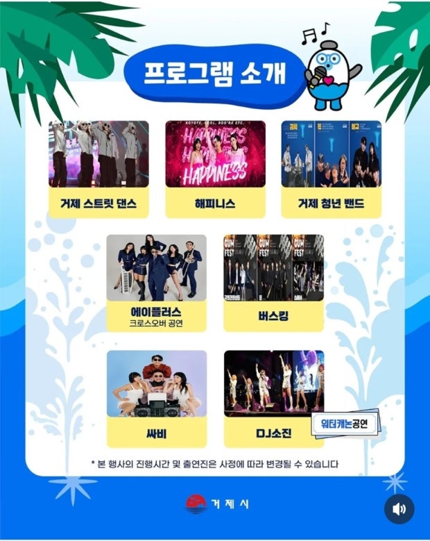 이번에는 **거제 청년축제 '워터붐붐' (2025년 9월 6일)**을 소개해 드리겠습니다. 시원하고 신나는 워터 뮤직 페스티벌 스타일의 축제로, 음악(Music) + 예능(Entertainment) + 물놀이(Water)가 결합된 청춘 축제입니다.