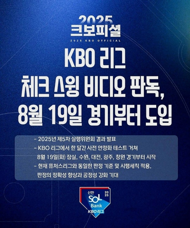 시행 시기: 2025년 8월 19일부터 KBO 정규리그 전 경기에서 체크스윙 비디오 판독이 본격 시행되었습니다.