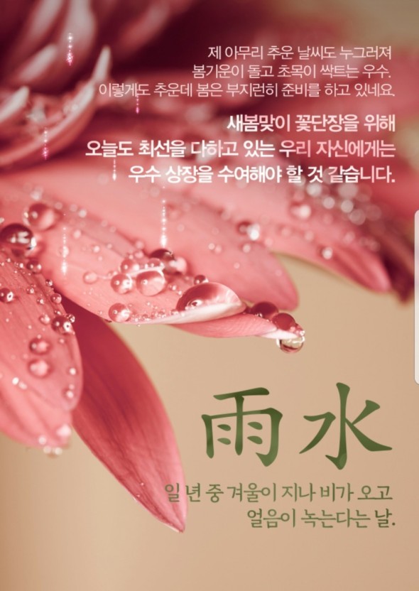 우수를 맞아 새로운 기운을 받아들이고, 다가올 따뜻한 계절을 준비해보는 것은 어떨까요?