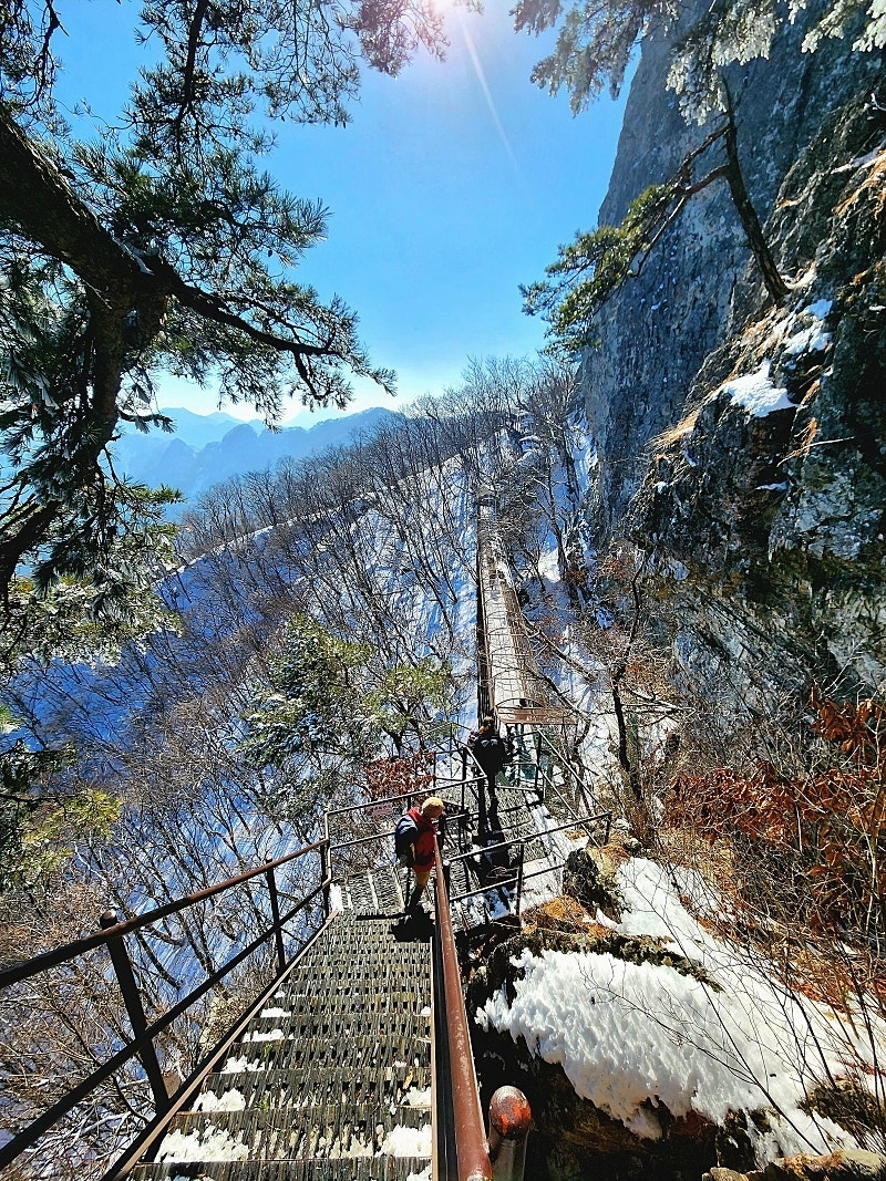 여러 단계의 철제계단을 힘들게 통과하여 정상을 향하는 능선에 올라서면 주변 산맥이 모두 눈으로 덮여 장대한 파노라마가 펼쳐집니다. 강한 바람에도 눈꽃은 굳건히 자리하고 있으며, 그 속에서 사진을 남기면 마치 겨울 산의 주인공이 된 기분이 듭니다.