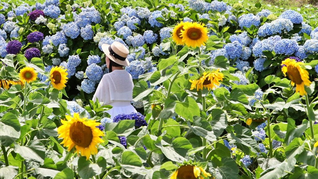 - 6월 말부터 7월 초까지 노란 해바라기와 보랏빛 수국이 함께 피어나며,
