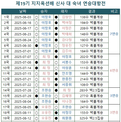 🏆 전설의 귀환! 이창호 9단의 7연승 - 2025 제19기 지지옥션배 🎉 이창호, 지지옥션배 7연승 질주의 기록 2025년 6월 말, 지지옥션이 후원하고 한국기원이 주관한 제19기 지지옥션배 신사 대 숙녀