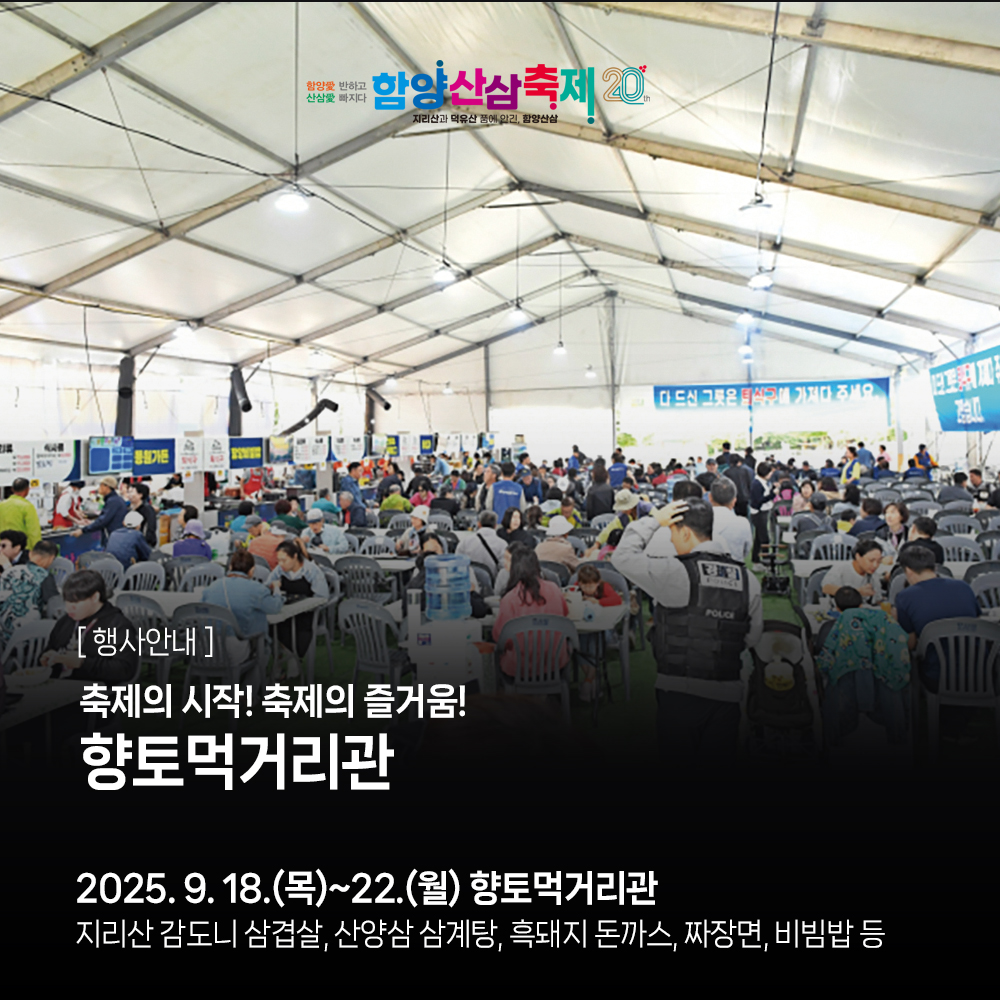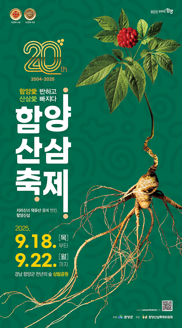 매년 가을 열리는 함양산삼축제는 우리나라 전통 약초 문화와 청정 자연을 직접 체험할 수 있는 대표적인 건강·힐링 축제입니다. 2025년에는 제20회를 맞이하여 9월 18일부터 22일까지 함양 상림공원과 함양군 일원에서 개최됩니다.