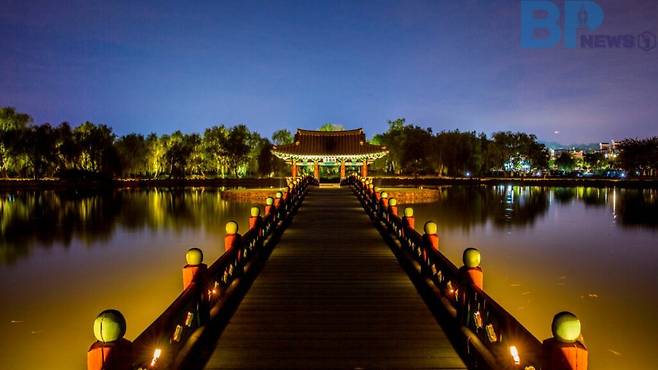 "궁남지 물 위에 핀 연꽃과 조명이 어우러진 낮과 밤의 풍경은,