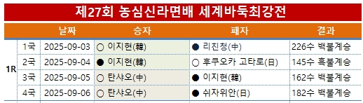 - 대회명: 제27회 농심 신라면배 세계바둑최강전