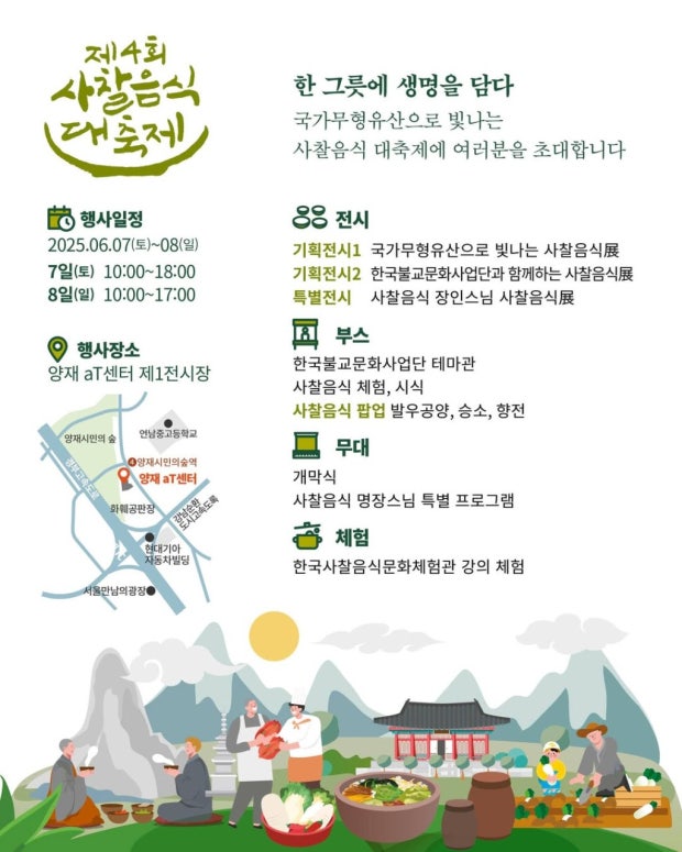 제4회 서울 서초구 사찰음식 대축제가 2025년 6월 7일(토)부터 8일(일)까지 서울 양재동 aT센터 제1전시장에서 개최됩니다. 이번 행사는 사찰음식이 국가무형유산으로 지정된 것을 기념하여, 그 전통과 현대적 가치를 널리 알리고자 마련되었습니다.