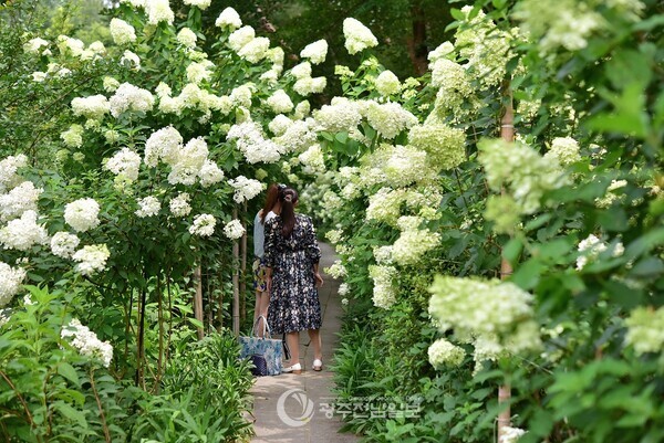 산림청의 “7월 추천 수목원·정원 10선”에 선정된 장소로, 눈송이처럼 흩날리는 수국이 강렬한 인상을 남깁니다.