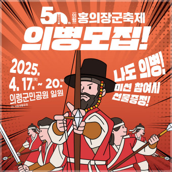 제50회 의령 홍의장군 축제는 임진왜란 당시 전국 최초로 의병을 일으킨 망우당 곽재우 장군과 17장령 및 수많은 의병들의 숭고한 호국정신을 기리고 계승하기 위해 개최되는 행사입니다. 1972년부터 시작되어 올해로 50회를 맞이하는 이번 축제는 2025년 4월 17일(목)부터 4월 20일(일)까지 4일간 경상남도 의령군 의령읍 서동생활공원 일원에서 열립니다.