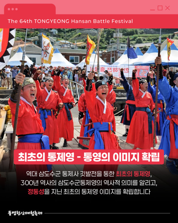 **“제64회 통영 한산대첩 축제는 수군의 역사를 바다 위에서 재현하고, 불꽃쇼·에어쇼·거리 퍼포먼스·체험프로그램까지 갖춘 역사·문화·엔터가 어우러진 해양축제”**입니다.