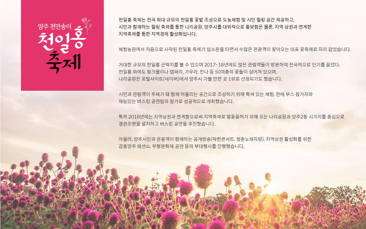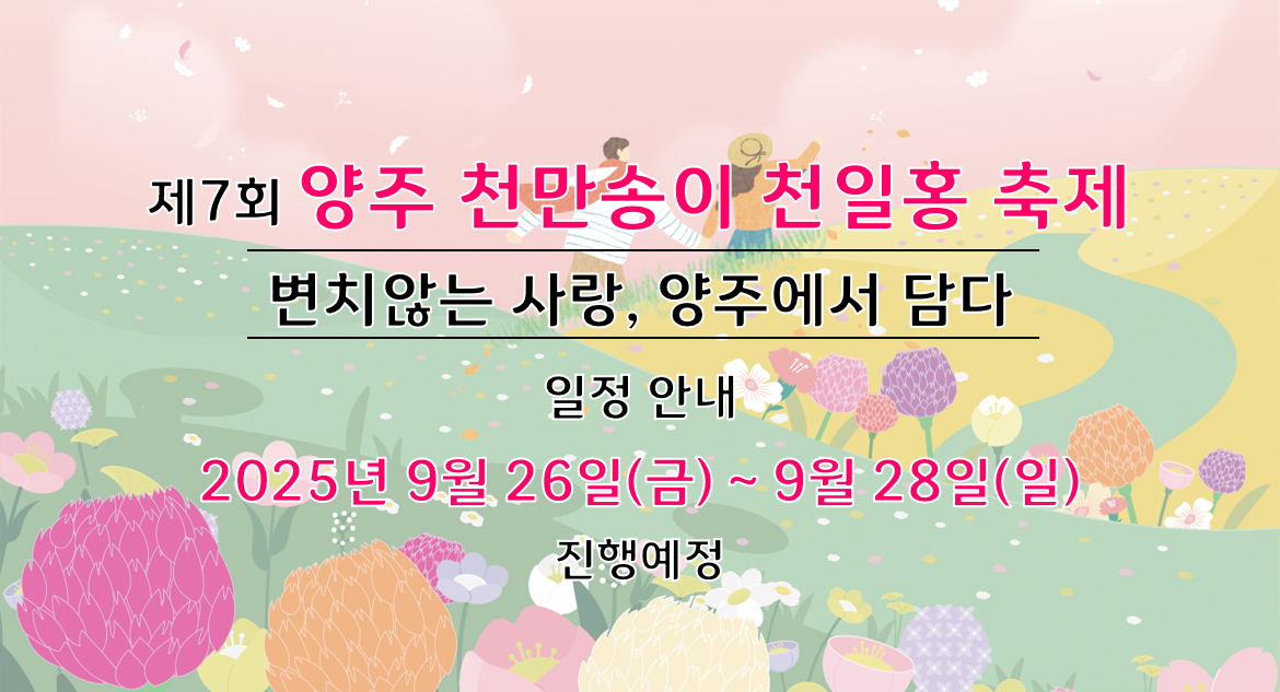 제7회 천만송이 천일홍축제는 분홍빛 천일홍이 펼쳐진 양주의 대표 가을꽃축제입니다. 플라워 퍼레이드, 콘서트, 다양한 체험 이벤트까지 풍성하게 구성된 문화 축제이기에, 가족 나들이, 연인 데이트, 친구와의 여행 모두에게 추천드립니다.