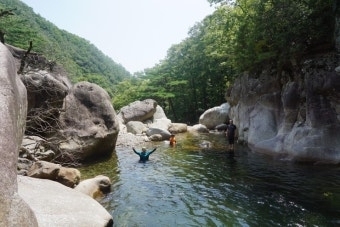 계곡 바닥은 돌이 많고 미끄러울 수 있으니 아쿠아슈즈나 샌들을 꼭 착용하세요.