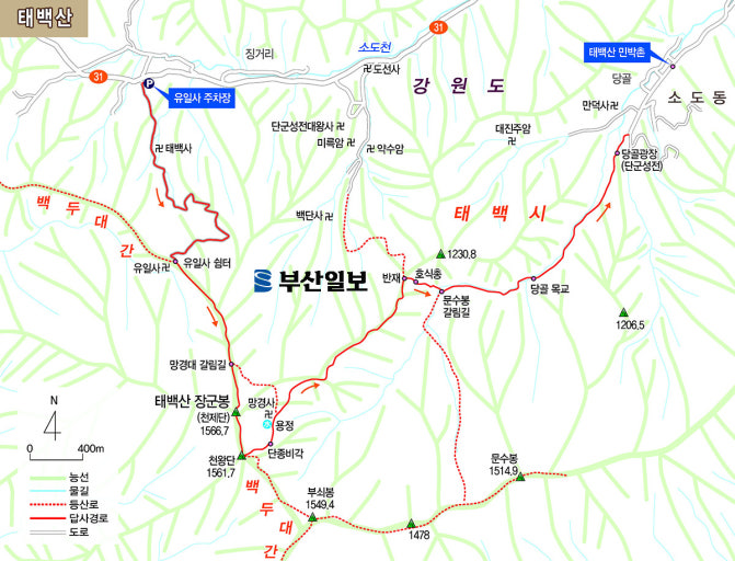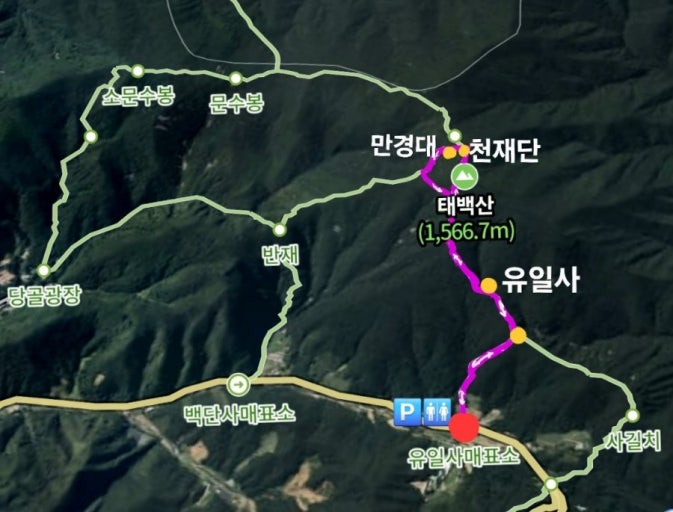 - 의미: 태백산의 최고봉(장군봉) 바로 아래에 위치하며, 민족의 성지이자 하늘에 제사를 지내던 천제단을 목표로 하는 코스임을 강조합니다.