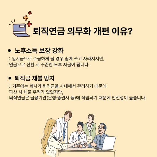 퇴직금의 연금가입 의무화 | 아직 전면 적용 X (입법·시행령 준비 중) |