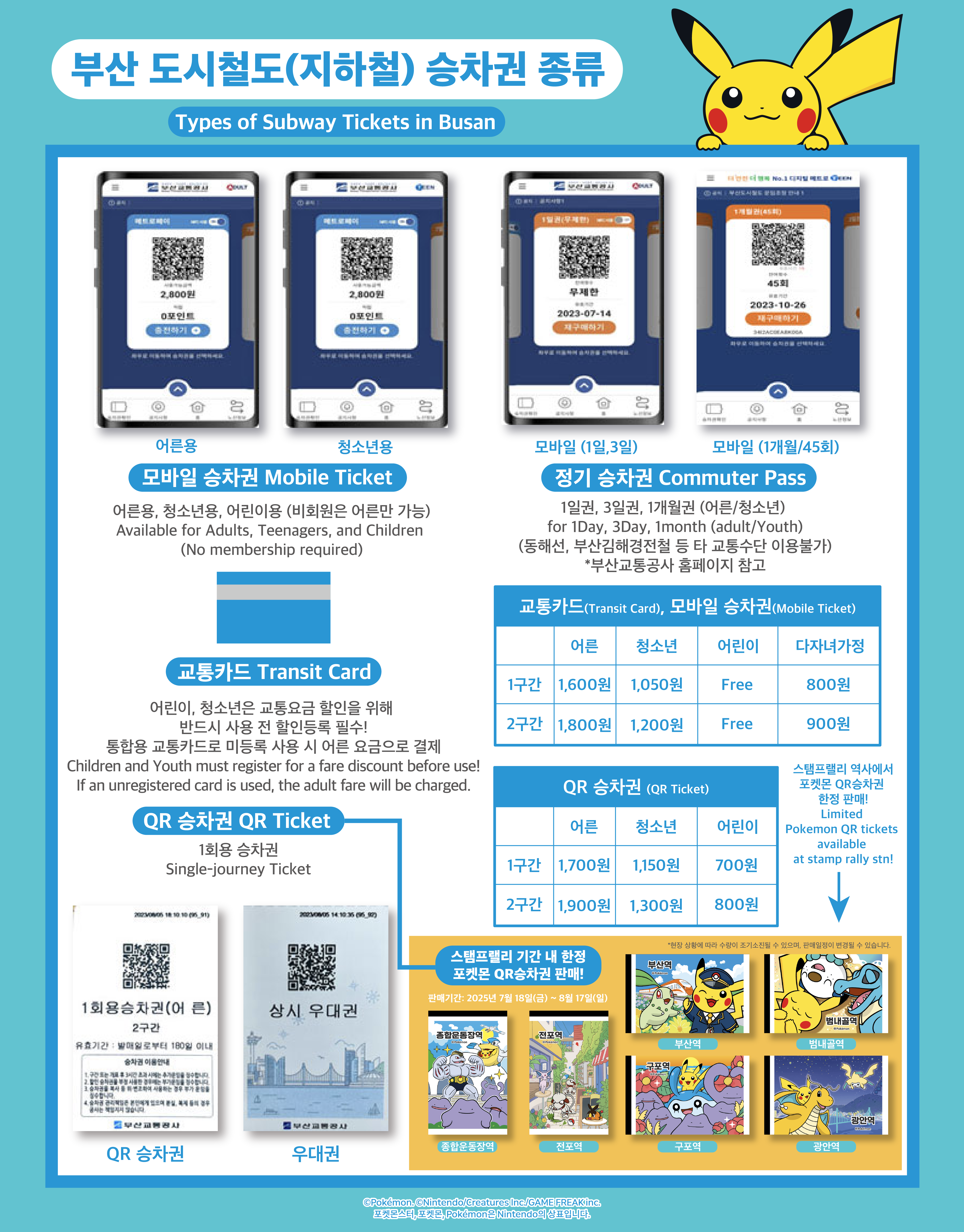 - QR승차권: 7/18~8/17 포켓몬 디자인 적용, 기념 수집용