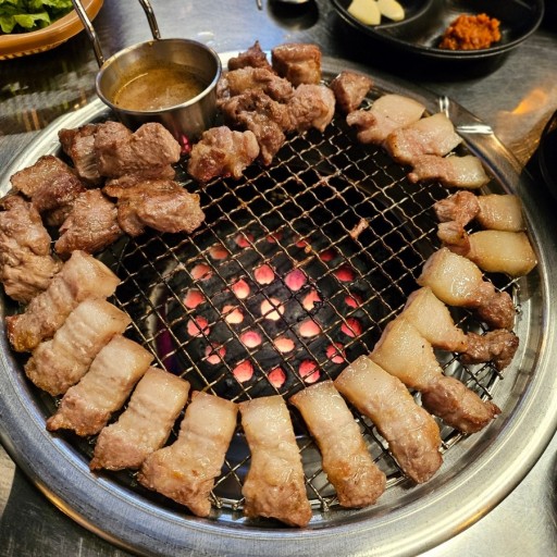 만장굴 탐방을 마친 후 숙소로 향하기 전 제주 전통음식을 맛보기로 했습니다. 해질 무렵 찾은 식당에서는 신선한 제주 돼지고기로 만든 흑돼지 구이가 인기 메뉴였습니다. 고소한 향이 퍼지는 가운데, 쌈장과 마늘을 곁들여 한입 베어 물자 육즙이 가득 퍼지며 환상적인 맛을 선사했습니다.