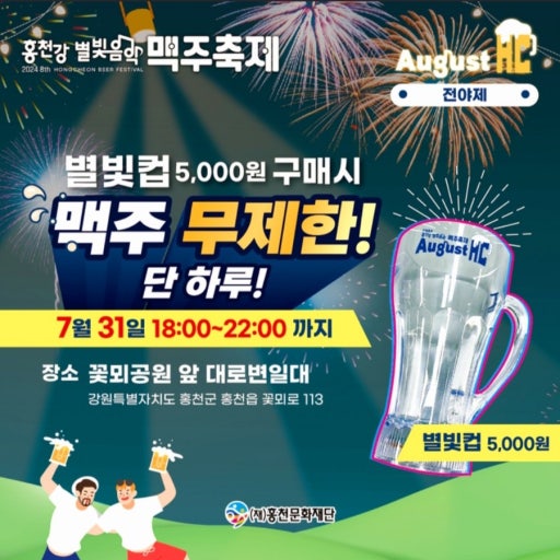 - '홍천군민의 밤' 컨셉의 전야제로, 5,000원 맥주컵 구매 시 맥주 무제한 제공 이벤트 주목!