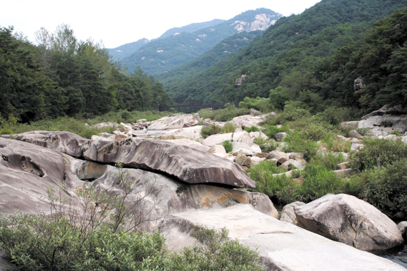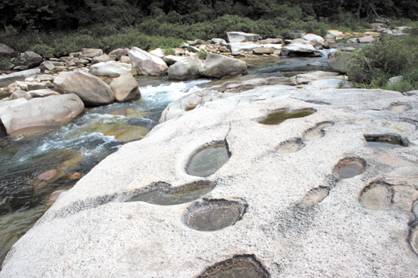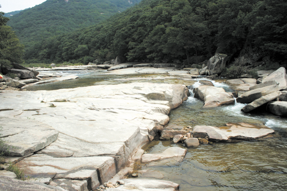 - 제9곡 파곶(巴串): 너른 바위 위로 흐르는 물결이 용의 비늘을 꿰어 놓은 듯한 형상이라고 하여 이름 붙여졌습니다. 이곳을 지나면서 계곡이 더욱 깊어집니다.