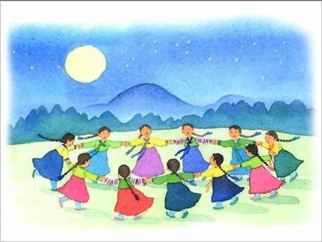 - 추석 밤 보름달 아래서 마을 여인들이 손을 잡고 빙 둘러서서 노래하며 춤춤