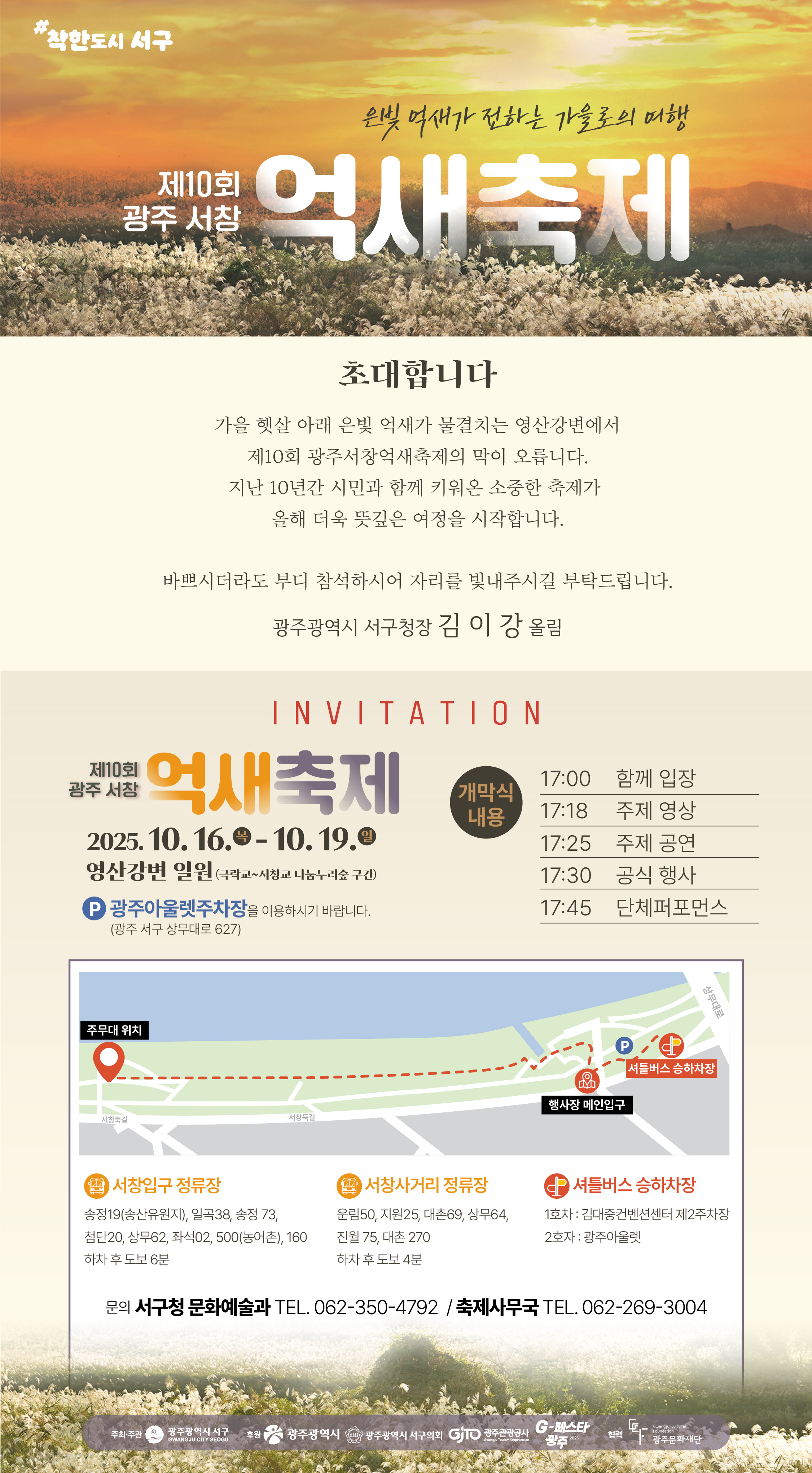 광주 서창 억새축제는 영산강변의 넓은 둔치와 강변 억새 군락을 활용한 도심형 가을 축제입니다.