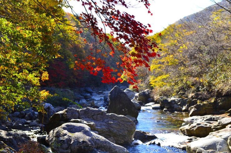 짙은 붉음과 계곡 물빛이 어우러져 “삼홍의 경치”라 불리는 차별적 미감 제공 - 비교적 부담 없는 트레킹 코스