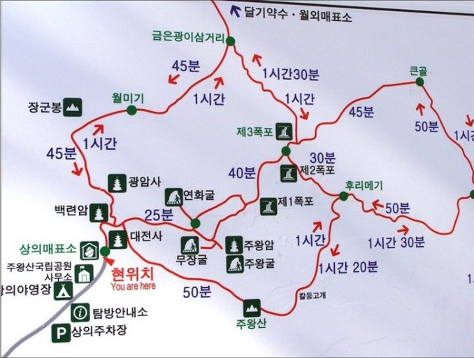 - 코스: 상의탐방지원센터 대전사 주봉(m) 칼등고개 갈림길 후리메기 삼거리 용연/용추폭포 학소대/기암 대전사 상의탐방지원센터
