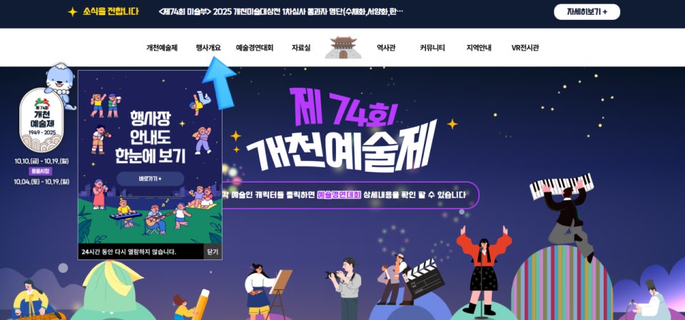| 미술 / 사진 전시 | 2025 개천미술대상전, 개천미술 실기대회 입상작 전시, 전국사진촬영대회 입상작 전시 등 |