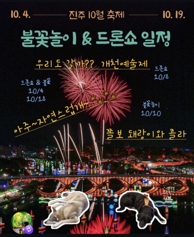 - 유등축제와 시너지: 10월 진주의 대표 두 축제가 동시에 열리며, 야경·유등·예술공연이 함께 어우러지는 ‘진주문화예술주간’을 형성
