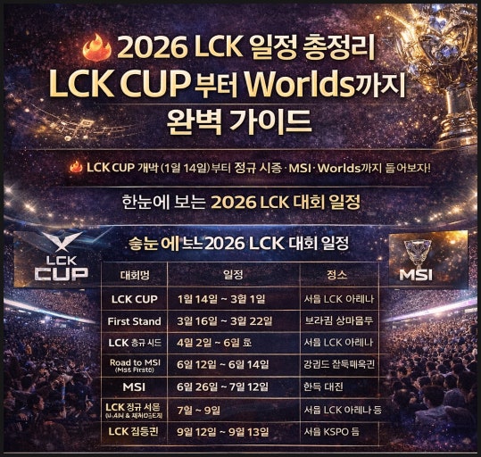 | 🏆 2026 LCK CUP 완전 가이드 (0) | 2026.01.20 |