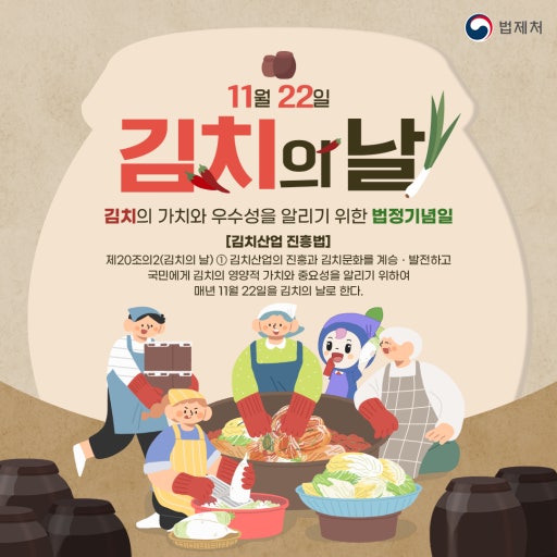 11월 22일 ‘김치의 날’은 한국 고유의 전통 음식인 김치의 우수성과 가치를 널리 알리기 위해 제정된 법정기념일입니다. 김치의 22가지 효능을 상징하는 날짜이자, 겨울 김장철이 본격적으로 시작되는 시기를 고려하여 11월 22일로 정해졌습니다.