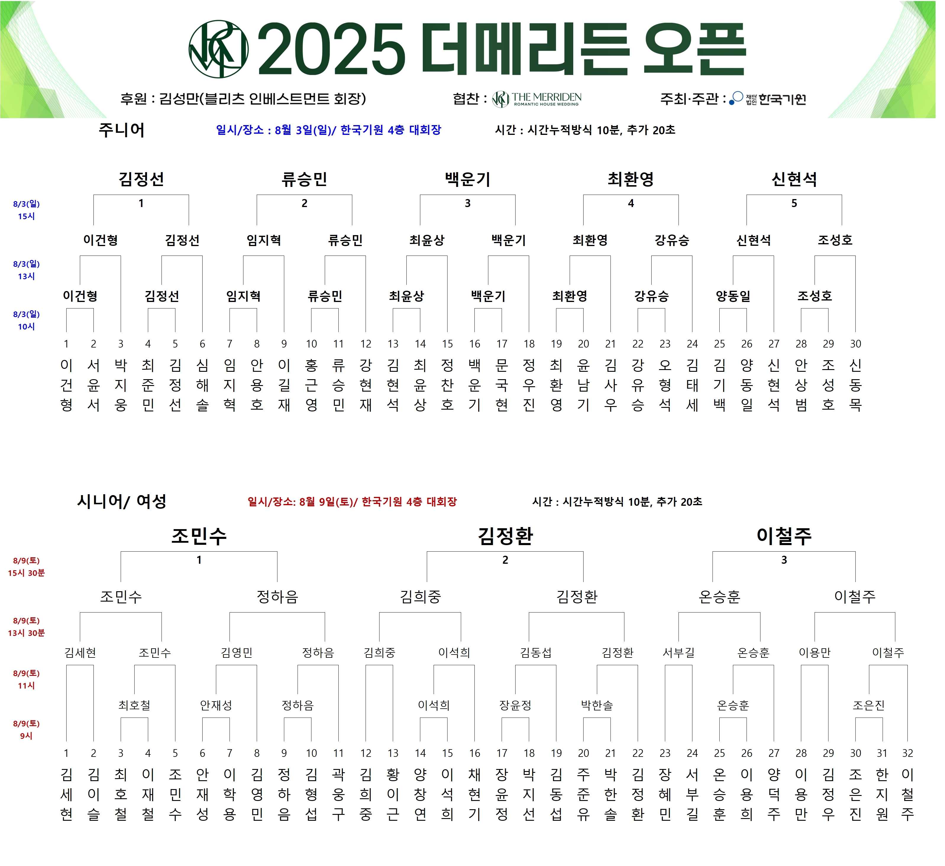 ‘더메리든 오픈’은 한국기원이 주최하고, 웨딩업체 더메리든이 협찬하는 신설 대회입니다. 만 45세 이상 남자 프로 시니어, 전체 여자 프로기사, 그리고 아마추어가 함께 경쟁하는 장이 마련되었습니다. 대회는 예선에서 총 24명이 본선에 진출한 뒤, 여기에 시드자 8명이 합류해 32강 토너먼트로 우승자를 가립니다. 결승은 총 3번기 방식으로 치러집니다.