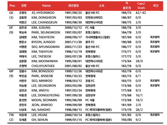 대표팀은 23명 가운데 J리그에서 뛰는 3명을 빼면 모두 K리그에서 활약하는 선수들이다. 모두 K리그1 소속이고 김동헌(인천)만 K리그2 선수다.
