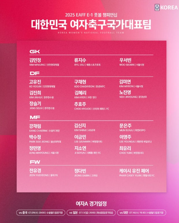 - 여자: 지소연, 장슬기, 최유리, 이금민