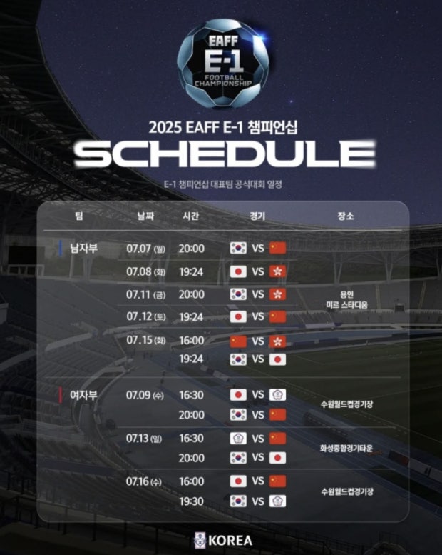 2025 동아시아 축구연맹(EAFF) E-1 풋볼 챔피언십 경기일정, 개최지, 출전국, 중계 정보까지 한눈에 확인하세요. 빠르게 2025 동아시안컵 정보를 원하시면 아래 버튼에서 확인하세요.