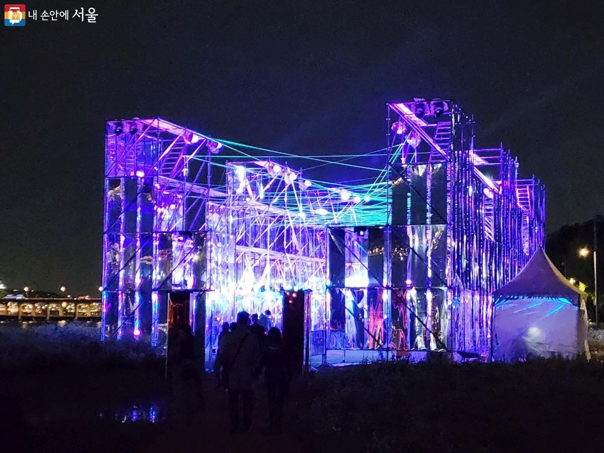 한강 수변이라는 자연적 배경과 서울 도심 조망이 결합된 공간에서, 빛과 영상이 유기적으로 어우러짐. - 밤의 관람 중심